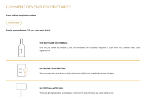 Vous pouvez rejoindre la grande famille des vigneron•ne•s des Vins de Morges en devenant propriétaire d’un cep de vigne pour seulement 150.-. Vous recevrez ainsi, pendant 5 ans, une bouteille annuelle de Chasselas étiquetée à votre nom, tandis que votre cep, marqué d’un écriteau personnalisé, est soigneusement entretenu par votre vigneron•ne•s.